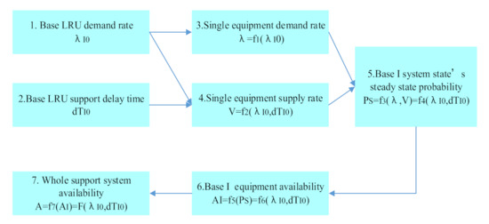 The multi-level spare parts demand–supply model integrates the multi-echelon and multi-indenture spare parts support process, demand rate solution, spare parts demand supply and supply rate solution content. It solves the steady-state probability of equipment system state and base equipment availability. Finally, we can extend it to all bases of the whole support system, to solve the most important equipment efficiency index in the spare parts system. That is the whole support system’s availability. The specific calculation sequence of support system availability is shown in Figure 10.