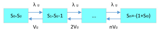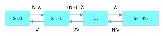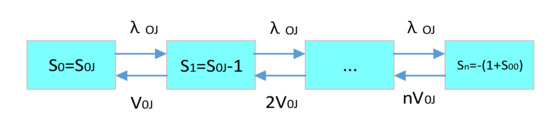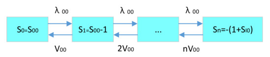 For the state variable, the maximum value is the initial inventory quantity. The minimum value is the negative value of the system’s maximum shortage. The specific demand–supply inventory status transition is shown in Figure 8.