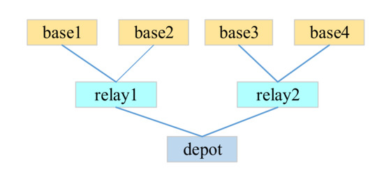 The equipment’s multi-level spare parts support includes multi-echelon maintenance supply level and multi-indenture equipment hierarchy structure support. Multi-echelon spare parts support refers to the support level corresponding to the equipment maintenance level. For the number of spare parts, we are usually interested not only in the required number of spare parts for each base but also in the spare parts storage required for the rear warehouse of each support base. Here, the base is called the first echelon and the rear warehouse is called the second echelon. For example, in most cases, the navy is considered a two-stage supply system. Sometimes, there are more echelons. For example, to support the deployed submarines, each submarine (first echelon) has some spare parts. At the same time, some spare parts are stored in the second-class supply ship, which can enter the submarine regularly. These facilities are supported by the third-echelon home port. Finally, there is the fourth echelon of the naval rear warehouse. Figure 3 shows a typical submarine multi-echelon support structure, which is composed of eight first-echelon stations, three second-echelon stations, two third-echelon stations and one fourth-echelon station.