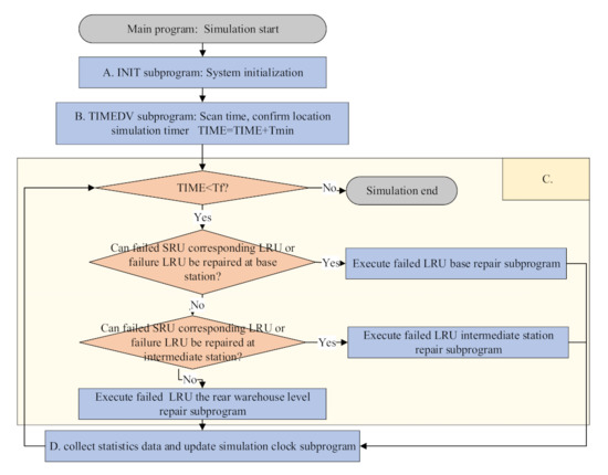 When the equipment is in normal operation, the whole equipment will stop due to the failure of one LRU. At this time, the base uses the methods of replacing lost efficacy parts and repairing failed parts to deal with the failed LRU. For the failed LRU, it should be transported to the base first. If the LRU storage space is in stock at this time, the LRU should be replaced immediately to complete the equipment repair. If the storage space is not in stock at this time, a spare parts shortage event of the LRU will occur. At the same time, due to the limited maintenance capacity of the base, the failed LRU will be maintained in the base with a certain probability. If it is not maintained in the base, the relevant spare parts manager will send the failed LRU to the rear warehouse for maintenance. He will make a replenishment application for the LRU in the rear warehouse. If the LRU storage space in the rear warehouse is in stock, the relevant spare parts manager will send the failed LRU to the rear warehouse for maintenance. Then, the spare part is added to the base LRU storage space. For the LRU maintained in the base, if it is found that the LRU failure is caused by one of its SRU failures, the failure SRU is also treated in a way similar to LRU. The failure SRU spare parts are replaced and repaired. For the failed SRU, if the SRU spare parts storage space is in stock at this time, the SRU will be replaced immediately to complete the failed LRU repair. Meanwhile, the relevant spare parts staff will send the successfully repaired LRU to the corresponding SRU spare parts storage space in the base. However, if there is no inventory in the corresponding SRU spare parts storage space, a spare parts shortage event will occur. At the same time, due to the limited maintenance capacity of the base, the SRU has a certain probability of repair in the base. After a certain maintenance time, the failed SRU is successfully repaired. The relevant spare parts staff will send the repaired SRU to the SRU spare parts storage space in the base. If the failed SRU cannot be repaired in the base, the relevant spare parts manager will send it to the directly corresponding upper-level site. Failed SRU will be repaired in the rear warehouse. He will make a replenishment application for the SRU in the rear warehouse. If the SRU spare parts storage space in the rear warehouse has inventory, the spare parts will be added to the SRU storage space of the base.