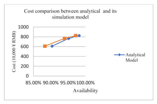 By substituting the three optimal inventory quantities of spare parts of the analytical model into the simulation model designed in the paper, the simulation availability is 88.29%, 93.97% and 97.19%. The specific data are shown in Table 10 and Figure 19. It can be seen from the comparison results that the availability of the analytical model is slightly higher than that of the simulation model. However, the relative error is within the acceptable range.