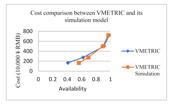 To further verify the rationality of the inventory plan obtained by our analytical model, this paper compares the results of the VMETRIC software in Reference [13]. The assumptions and input parameters refer to the literature [13]. Here, we also input the data of the literature, and the comparison results are shown in Table 11. The unit availability cost difference = (VMETRIC software cost—analytic model cost)/current availability lower bound. This variable is defined here to represent the advantage of the analytical model over VMETRIC software from the cost perspective. The cost comparison between the VMETRIC model and its simulation model is shown in Figure 20. The cost comparison, unit availability cost difference and relative error between the analytical model and the VARI-METRIC model are shown in Figure 21.