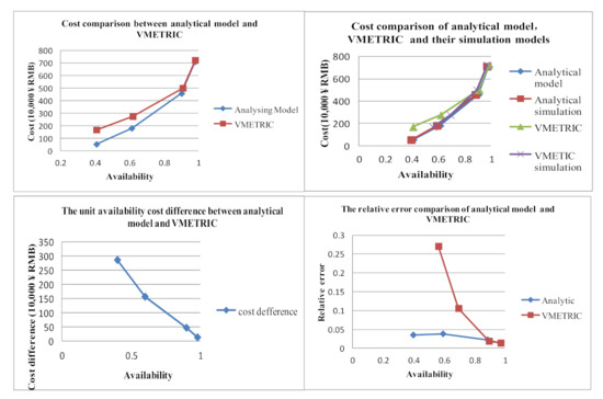 First, when the low availability abound of equipment system is 0.4, 0.6, 0.9, 0.98, the relative error between analytical model and simulation model is 3.54%, 3.86%, 2.29%, 1.29%, the relative error between VARI-METRIC model and its simulation model is 27.06%, 10.60%, 1.88%, 1.14%. Comparing the relative error of availability between the analytical model and VMETRIC software, it is found that the accuracy of the analytical model is higher than that of VMETRIC software when the lower availability bound is small. Its relative error is less than 4% when the availability lowers to 60%. However, VARI-METRIC’s relative error is greater than 10%. However, when the lower availability bound is large enough, the VARI-METRIC accuracy is approximately consistent with that of the analytical model. Even the VARI-METRIC accuracy is a little higher than that of the analytical model.