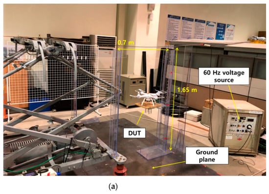 To measure the voltage induced in the sensor with respect to the electric field, an experimental setup was constructed, as shown in Figure 6. This setup reproduced a railway environment with overhead lines. Figure 6a shows the overall configuration of the experimental setup, which consisted of a ground plane, overhead line, and voltage source. Typically, a high voltage of 60 Hz and 25 kV is supplied in the overhead lines of railway environments. Therefore, a voltage source of 60 Hz was used. In the experiment, the generated voltage was in the range of 1 to 25 kV. For the ground plane, a wide metal plate was used. The wide metal plate was connected to the ground of the voltage source, and the (+) terminal of the voltage source was connected to the overhead line. The overhead line was located 1.65 m above the ground plane. The length of the overhead line was 2 m. The ground plane and overhead lines were electrically disconnected. When a voltage was applied to the overhead line, an electric field was generated between the overhead line and ground plane. To examine the effects of the electric field on the proposed sensor, the proposed sensor (DUT) and a commercial electric field analyzer were placed between the overhead line and ground plane. An electric and magnetic field analyzer (EHP-50F) was used to measure the 60 Hz electric field in the vicinity of the overhead line. Data were acquired at various positions, and the details are presented in Figure 6c. Because the electric field is a vector quantity, it has a direction. The x, y, and z directions of the field analyzer are indicated in Figure 6b.