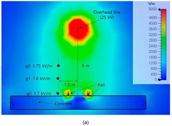 Figure 8 shows the results of a simulation of the electric field intensity when a voltage of 25 kV is applied to the laboratory setup. It can be seen that the simulated electric field intensity shows a similar trend to the measured electric field intensity for each position of the sensor. The simulation result has a slightly lower electric field value than the measurement result. Considering the positions at which some discrepancies from the measured values are observed, these differences may have occurred because the simulation was unable to the accurately model the metal apparatus at these locations (i.e., the pantograph, supply power cable, etc.).