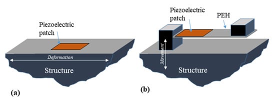 The piezoelectric effect is a material feature that converts mechanical energy in the form of pressure or vibration into electrical energy []. Stress can cause ions to reposition, generating electrical displacements, which can result in spontaneous polarisation and the formation of an electric field. Ferroelectrics are a kind of substance that have the ability to conduct electricity. Energy harvesters based on piezoelectric technology have been deployed to collect energy from a variety of vibrations. There are two installation schemes to harvest energy from piezoelectric materials: (a) directly installing the piezoelectric element on the host structure undergoing surface deformation and (b) attaching cantilever beams with piezoelectric element bonded on a host structure where large base excitation is expected. Both schemes are schematically shown in Figure 3. For the first scheme, the host structure’s dynamic is not changed during the process of power harvesting. Thus, there is limited room for improvement in the energy-harvesting system. For the second scheme, the cantilever beam is attached to the base structure, and enhancement of efficiency is possible by tuning the dynamic of the harvester. The second design is often preferred if the system has the capability of hosting the transducer because a certain model of piezoelectric energy-harvesting systems can be developed.