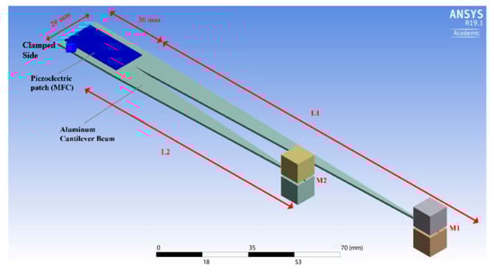 Yang et al. [] evaluated piezoelectric applications, with a particular emphasis on approaches that provide high-power outputs while maintaining a broad operating bandwidth. With the help of theoretical calculations and experimental tests, Yang et al. [] were able to demonstrate the performance of piezoelectric energy-harvesting systems from linear and non-linear vibration sources. They showed that the output power was proportional to the excitation and response phase differences. Wei and Jing [] evaluated the model of piezoelectric vibration-based energy harvesters, in which ceramics or polymers were used as base materials; they discussed the implications of this work. Zhang et al. [] concentrated on the non-linear resonance frequencies and widening the bandwidth of piezoelectric energy harvesters, as well as analysing the non-linear effect in the vibration systems. Moreover, Yildirim et al. [] presented a technique for enhancing the conversion of ambient energy, as well as tuning the resonance frequency of the system. Matching frequency is necessary to enhance the performance of energy-harvesting systems. With the help of electrical characteristics measured under various bending conditions, Cao et al. [] demonstrated the use of the transverse piezoelectric effect to create a water-resistant and self-powered sensor. The results show that the electrical characteristics have a linear dependence on voltage and an inverse-square-root dependence on power. Izadgoshasb et al. [] introduced a new geometry for the cantilever beam that can widen the frequency bandwidth. As shown in Figure 4, they used a branched beam in their design, which resulted in obtaining two close resonant frequencies.