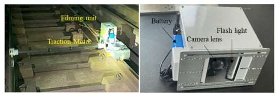 Images and videos are collected using an image acquisition system, which consists of commercially available off-the-shelf components, mainly including a line-scan camera, light source, ambient light sensor, and Gigabit Ethernet interface (frame grabber). The line-scan camera (model raL2048–48gm; Basler, Ahrensburg, Germany) has a resolution of 2048 × 2048 pixels and a maximum line rate of 51 kHz, and the computer–camera frame grabber captures rail images. The line-scan camera is calibrated at 2048 lines per second with exposure time of 0.1–0.14 ms facing vertically down the rail track, as shown in Figure 1.