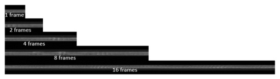 Multiscale frames with scale factors of 1, 2, 4, 8, and 16 are concatenated (Figure 3), where a scale factor of k (=1, 2, 4, 8, 16) refers to the concatenation of k consecutive frames. As corrugation may exist in long rail sections, small images may cut corrugation waves, hindering detection. On the other hand, having a very large-scale image may include a mixture of normal and corrugated rail sections, decreasing the accuracy of corrugation localization. We experimentally determined that a scale factor of 8 provided the best identification results (Table 1).
