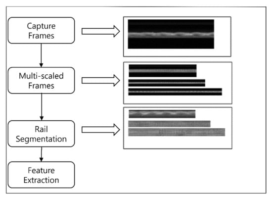 The acquired data are preprocessed for rail corrugation identification. Preprocessing focuses on creating multiscale images and rail track extraction, and corrugation identification comprises feature extraction and classification.