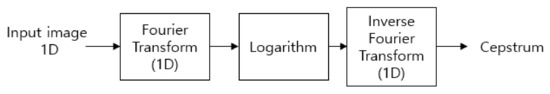 We extract features in the cepstral domain or the frequency domain. The cepstral domain is adopted because the cepstrum provides features that are independent of pixel amplitude variations (i.e., scale invariance) or grayscale changes, increasing the robustness against illumination variations [24]. As a Fourier transform is used, these features are also independent of translational shifts [24]. The cepstrum is defined as the inverse Fourier transform of the log-magnitude (Fourier) spectrum [25], as illustrated in Figure 5.