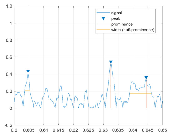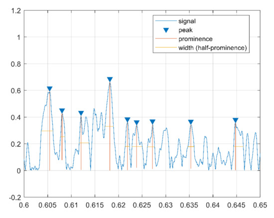 The cepstrum peaks are also used as features in the form of variance of peaks distance, sum of peak prominence, variance of peak width, sum of peak width, and variance of peak prominence. These features are extracted in the cepstrum domain and reflect clear differences between corrugated and normal rails. In fact, a corrugated rail has higher peaks, larger prominence, and smaller width than a normal rail, as shown in Figure 6 and Figure 7, respectively.