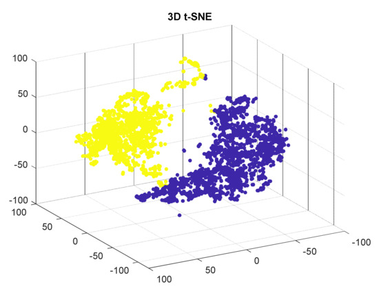 Visualizing a dataset in the feature space allows validation of the effectiveness of the selected features for clustering the target classes. To facilitate visualization, a 3D plot of t-Distributed Stochastic Neighbor Embedding is used. (t-SNE) is a (prize-winning) technique for dimensionality reduction that is particularly well suited for the visualization of high-dimensional datasets (Figure 8). Features were extracted from 1665 corrugated samples and 1831 normal samples.