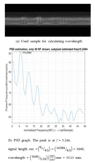 For the power spectral density analysis, we obtained the peak frequency component from a frame with 16,384 × 2048 pixels (length × width) Figure 12a. The corresponding power spectrum is shown in Figure 12b, and the peak frequency is f = 5.246 Hz, which is the dominant frequency in the image. Subpixel-level frequency estimation was computed using the algorithms described in Section 3.2.5 and performed along with corrugation wavelength calculations in different positions (Table 4). By using a ruler, 1 cm of the rail surface was found to contain approximately 126 pixels, corresponding to . This value slightly changed depending on the distance between the lens and rail surface.