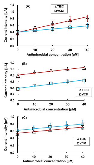 Figure 6A–E show a relationship between the current intensity at 0.80 V vs. Ag/AgCl and the antimicrobial concentration. In the concentration range 0–40 µM of VCM, all relationships showed high linearity (R2 > 0.900). This concentration range translates to 0–60 µg/mL, which covers the target trough range of (15–20 µg/mL) [21] for VCM blood concentration and the peak concentration range (20–40 µg/mL) [1]. The sensitivity of each electrode to antimicrobial agents is shown in Table 2.