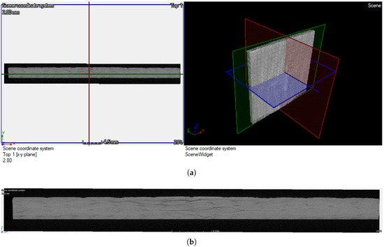 The scanning using the XCT technique was performed by Machinefish Materials & Technologies Sp. z.o.o. Sp. k. (Wrocław, Poland). Before scanning, the specimen was cut to dimensions of 40 × 70 × 2.5 mm based on the results of the ultrasonic testing [4] in such a way that the cutting process had no influence on the introduced BVID. The scanning was performed using the XT H 225 ST industrial computed tomography scanning system (Nikon, Tokyo, Japan) with the 225 kV reflection and 180 kV transmission targets. The scanning volume was defined as 40 × 40 × 2.5 mm, which covered all elements of the resulting damage that appeared during LVI and resulted in dimensions of a single voxel of 0.022 × 0.022 × 0.01 mm. The resulting scan was obtained in a form of a grayscale 3D array, which was sliced in a direction normal to the surface of the dedicated software specimen using the myVGL 2.2 (Volume Graphics GmbH, Heidelberg, Germany) and then exported in a form of a sequence of 2D images. A view of the XCT scan with indicated slicing planes is presented in Figure 1a, while the exemplary slice is presented in Figure 1b.