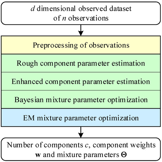 The task is far from trivial and is achieved iteratively by applying the numerical procedure thoroughly described in [41,45,46,47]. Besides REBMIX there exist other prominent algorithms for finite mixture estimation. The Expectation Maximization (EM) algorithm introduced in [48] is one of them. Today, after more than 40 years, it is still one of the most popular algorithms for statistical pattern recognition. It has turned out to be favorable to combine both algorithms [42]. The REBMIX provides c, , and , which tend to be close to optimal, while the EM algorithm aims to reach the global optimal solution. This way, the best is gained from the algorithms.