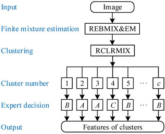 The first step in image segmentation is a finite mixture estimation, as shown in Figure 2. Let be an observed d dimensional dataset of size n of continuous or discrete vector observations . Each observation is assumed to follow the predictive mixture density