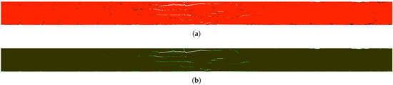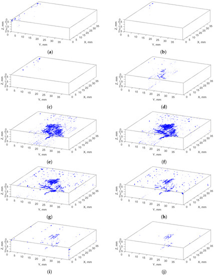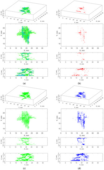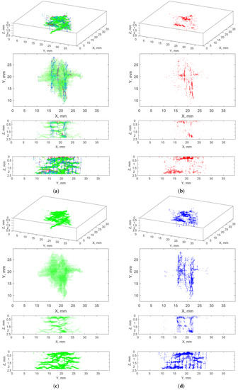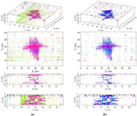 Figure 7 presents 3D and side views of the cumulative clusters of the anomalies (the clusters are marked with different colors), namely all the clusters (a) and the clusters selected as cracks (b). A comparative analysis of these visualizations proved the correctness of the selection of the crack clusters, since an excess of noise is removed while the crack regions remained in the resulted images. Some pixels representing the external surroundings of the cracks (areolas) could be omitted due to excluding the clusters −4–−9, however, the level of their noise was too high to include them to the result.