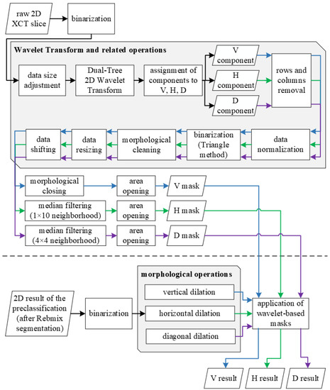 After initial processing, each slice of the sequence considered of the 2D XCT slices was subjected to further processing using the DTWT algorithm. DTWT was selected in this study due to its high directional selectivity, as well as its robustness to noise [50], which was confirmed in previous studies related to structural damage identification [49]. A single-level decomposition using the 2D real oriented dual-tree wavelet transform using 10-tap Kingsbury Q-shift filters resulted in 8 sets of directional detail coefficients. The selection of a single-level decomposition was forced by the need to retain appropriate spatial resolution of the resulting data after decomposition, while the selection of a wavelet basis represented by the above-mentioned filters was based on previous analyzes of performance of various directional wavelet transforms and filterbanks cited above. The resulting wavelet coefficients can be grouped into three predominant directions: horizontal H, vertical V, and diagonal D. According to this, the resulting sets of detail coefficients were added up following the directions of sensitivity: