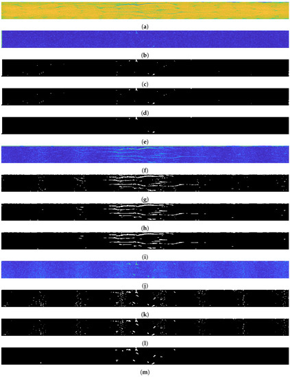 where the numbers in the lower indices denote the subsequent numbers of the absolute values of the detail coefficients d obtained after decomposition using DTWT. Next, the resulting values , , and were assigned to the initial masks. The previously added empty rows and columns used to fulfill the requirements of DTWT were removed (see the result in Figure 9b,f,j) and the resulting data were normalized to 8-bit integers, which was necessary for a further binarization procedure. Binarization was performed using the Triangle method [51], which was empirically selected and revealed the best thresholding results (see Figure 9c,g,k). In the next steps, morphological cleaning was performed in order to filter out single pixels. Then, the original dimensions (reduced due to the application of DTWT) were restored, and a shifting operation was applied in order to eliminate the boundary effect resulting from the application of DTWT. Further operations were focused on additional improvement of the masks in order to enhance the extraction of the vertical, horizontal, and diagonal objects, and remove noise as follows: