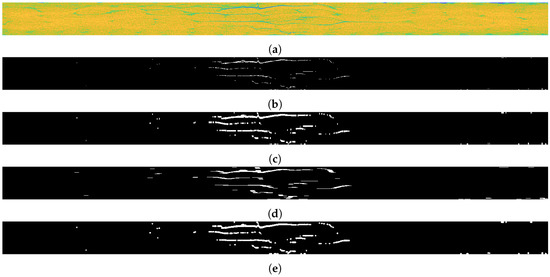 Taking into account that some pixels representing cracks could have been omitted during the crack recognition stage after REBMIX&EM segmentation (the clusters with crack surroundings were excluded due to the high level of noise), the recognized cracks (Figure 11b) were binarized (nonzero pixels assigned to ones) and then slightly expanded using a morphological dilation) before filtering with the prepared masks to improve the ability to classify cracks. The image with the recognized cracks was dilated in three ways (using a structuring element oriented vertically (Figure 11c), horizontally (Figure 11d), and diagonally (Figure 11e)), which allowed obtaining three resulted images to be filtered by the corresponding masks. Filtering using the masks was performed by finding common regions between the pairs of images.