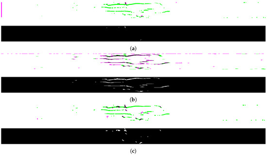 Figure 12 presents the final 2D results of the exemplary CT slice, i.e., the pixels with components V, H, and D, representing the three classes of cracks considered. The upper images show the differences between the recognized and dilated cracks with the corresponding masks (black regions in the composite image show where the two images have the same intensities; magenta and green regions show where the intensities are different), whereas the lower images present binary results (common regions).