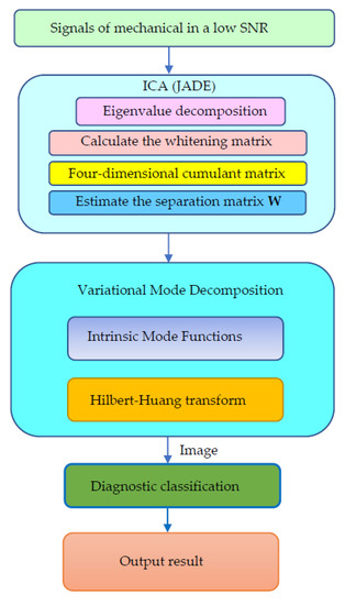 Figure 1 provides the entire flow chart of ICA-VMD and explains how to implement it. There are mechanical systems that obtain signals through sensors at low SNR. JADE based on the above ICA theory separates noise and main components. The main component obtains the IMF through VMD, and then obtains the time-frequency diagram through Hilbert-Huang transform.