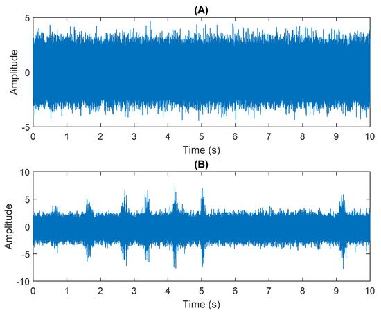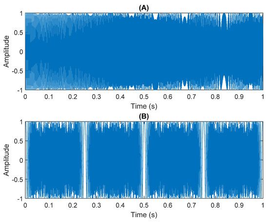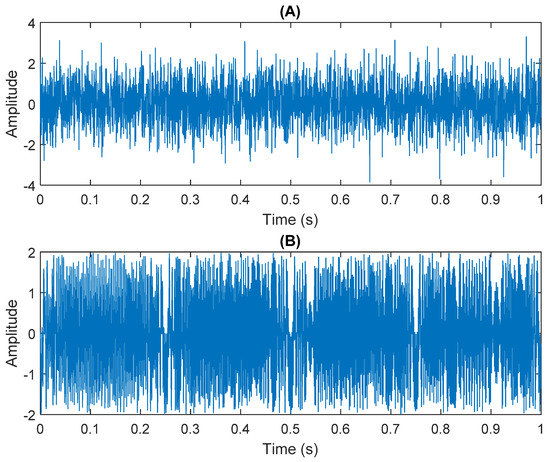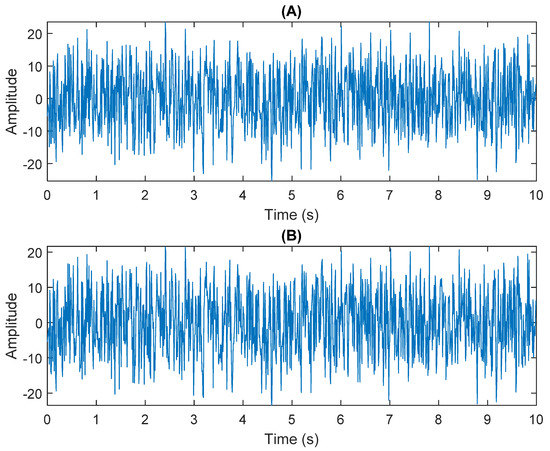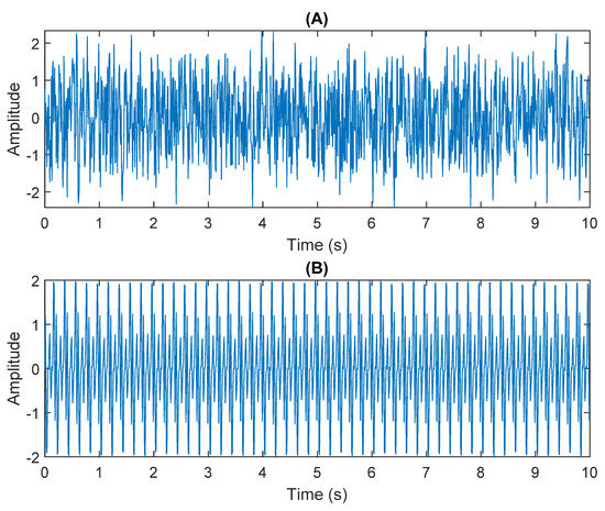 The numerical simulation of data received by two sensors: (A) In Equation (31) the sensor signal x1. (B) In Equation (31) the sensor signal x2.