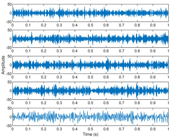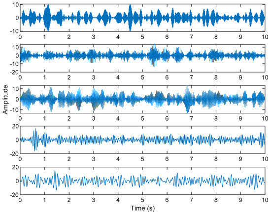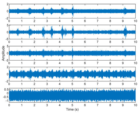 In this research, the element of matrix A was randomly selected not because the element A is unknown in the real situation, but because the noise parameter is increased in order to obtain a low SNR. The SNR of white Gaussian noise and the original signal was –21.3728. Figure 12 shows the time domain of the data received by the two microphones. Figure 13 shows the VMD component obtained by direct application of numerical simulation. VMD cannot separate the noise from the signal or decompose the signal into its constituent components under low SNR conditions. Figure 14 shows the results of the Hilbert spectrum of the VMD component obtained from the numerical simulation of the sensor. Therefore, the goal of ICA theory is to obtain a separation matrix W through X, so that the signal Y obtained by W acting on X is the optimal approximation of the independent source S. The W matrix is expressed as follows: