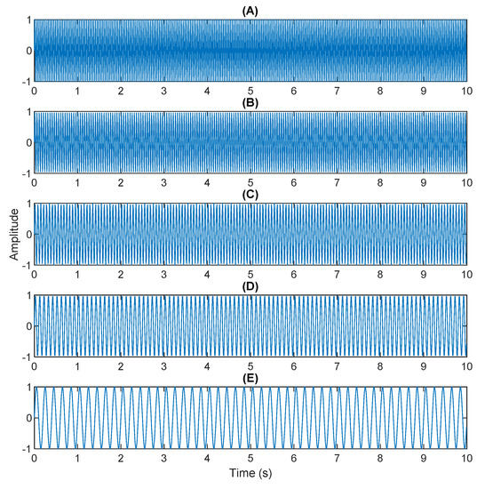 Original sources: (A) 25 Hz sin waveform; (B) 20 Hz sin waveform; (C) 15Hz sin waveform; (D) 10 Hz sin waveform; (E) 5 Hz sin waveform.