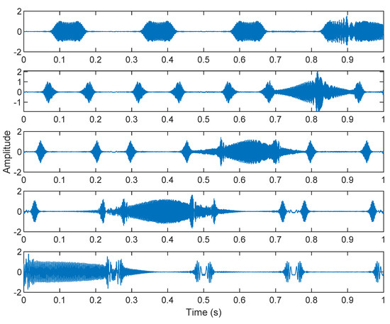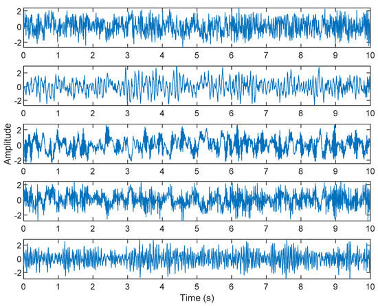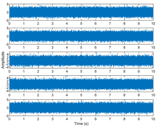 The cocktail party problem is the most famous example of ICA applications [40]. There are five different positions—s1, s2, s3, s4, and s5, of which five original sources are contaminated by white Gaussian noise. In the simulation, s1(t), s2(t), s3(t), s4(t), and s5(t) are, respectively, 5, 10, 15, 20, and 25 Hz sine waveforms, and n(t) represents white Gaussian noise. When six sound sources appear at the same time, two sensors are installed in different positions to record sound. Only two sensors are used to measure six sources. The signals received by the two sensors can be expressed as: