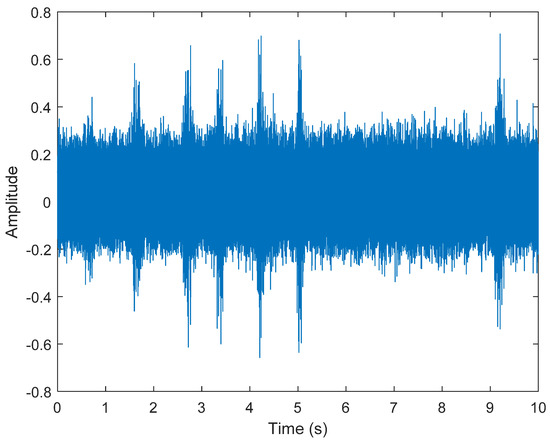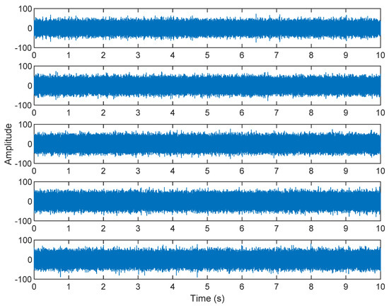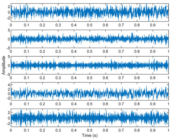 In the third case, Case Western Reserve University (https://engineering.case.edu/bearingdatacenter/download-data-file (8 November 2021) was used to provide test data on faulty bearings of motors. Experiments were carried out using a one horsepower motor, and acceleration data were measured near and far from the motor bearing. Electrical discharge machining (EDM) was used to diagnose faults in motor bearings. A fault with a diameter of 0.021 inches (0.5334 mm) was introduced into the inner raceway. The faulty bearing was reinstalled into the test motor and the vibration data of the motor load of one horsepower (motor speed is 1774 RPM) were recorded. SKF bearings were used. Vibration data were collected using an accelerometer, which was connected to a housing with a magnetic base. The accelerometer was placed at the 12 o’clock position of the drive end and the fan end of the motor housing. A 16-channel DAT recorder was used to collect the vibration signal, and post-processing took place in the MATLAB environment. Then, 48,000 samples per second are collected for drive end bearing failures, and a total of 10 s was recorded. In the simulation, s1(t) was the fault data of the motor bearing and n(t) was the white Gaussian noise, which simulated the noise of other interferences. Two accelerometers were installed in different positions for the measurement. The signals received by the two accelerometers can be expressed as: