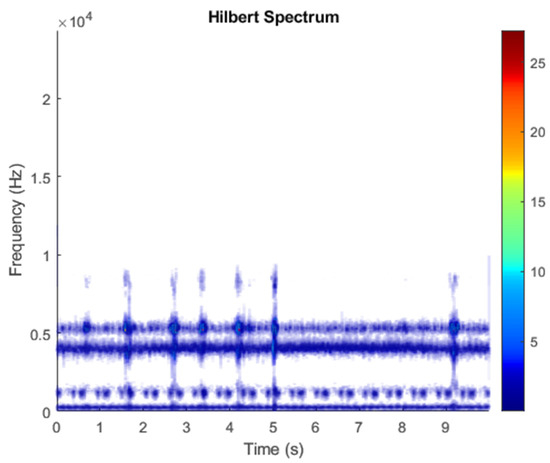 After ICA finds the matrix W, the result of multiplying X to estimate Y as in Equation (3) can be shown in Figure 24. ICA obtains two signals: one is noise and the other comes from a mixed source. After separating the signal and noise, the VMD method is used to decompose the data from these mixed sources into its component parts. Figure 25 shows the ICA-VMD components obtained from the data. Figure 26 shows the separated data of ICA-VMD’s Hilbert Spectrum results. Figure 27 shows the original source of motor bearing failure. The results show that ICA-VMD guarantees the effective restoration of the original data. This result can be clearly seen in 350, 1.3k, 4k, and 5.3k Hz, and blue is the frequency of the bearing rotation. The bearing failure points were at 0.6, 1.6, 2.8, 3.3, 4, 5, and 9 s, where the blue is more obvious and also shows a wider frequency. Figure 28 and Figure 29 show the results of doing VMD first and then ICA. VMD-ICA cannot effectively recover the original signal in a low SNR environment.