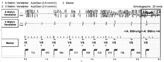 - Gombotz, H.; Anelli Monti, M.; Leitgeb, N.; Nürnberg, M.; Strohmer, B. Perioperatives Management von Patienten mit implantiertem Schrittmacher oder Kardioverter/Defibrillator. Empfehlungen der Osterreichischen Gesellschaft für Anästhesiologie, Reanimation und Intensivmedizin, der Osterreichischen Kardiologischen Gesellschaft und der Osterreichischen Gesellschaft für Chirurgie. Anaesthesist 2009, 58, 485–498. [Google Scholar] [CrossRef]