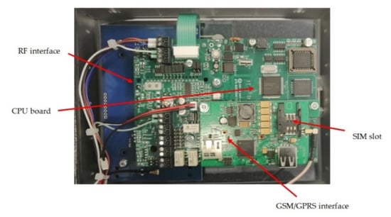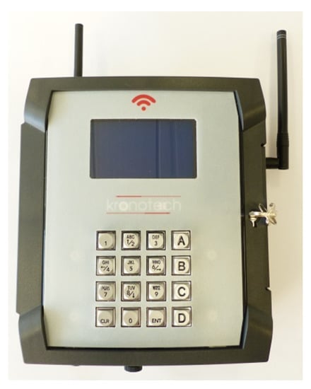 The Central Unit (Figure 2) can simultaneously manage up to six probes and should be placed within 30 m from gestating cows. Before insertion, the intravaginal device is activated through the Central Unit and a progressive number is attributed, so that when the alarm is received, the calving cow could be immediately recognized. The Central Unit is powered by +12 V through a transformer power supply but in case of energy network blackout the internal battery ensures a short interval of life (5 min on average), which is sufficient to send a warning through SMS. The apparatus (Figure 3) is equipped with a slot for the cell phone Sim card, thus it is able to communicate with user’s contacts by GSM/GPRS. The communication between the vaginal probes and the Central Unit is based on a 868 MHz radiofrequency; both of them can work within a temperature interval from −20 °C to +55 °C.
