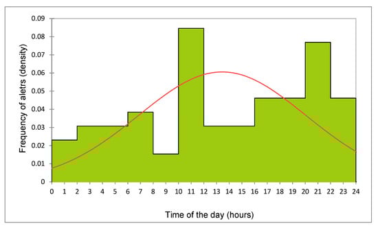 Distribution of phone alert reception for imminent calving, during the day, expressed as the proportion of calls within 24 h (density). The red line describes the fitted distribution of calls.