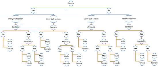 Summary of decision-tree for the application of calving sensor in pluriparous cows. Each point reported in the figure, such as dairy bull semen and dystocia, represents a binary option based on data reported in Table 1. Data cannot be represented due to the very large size of the figure.