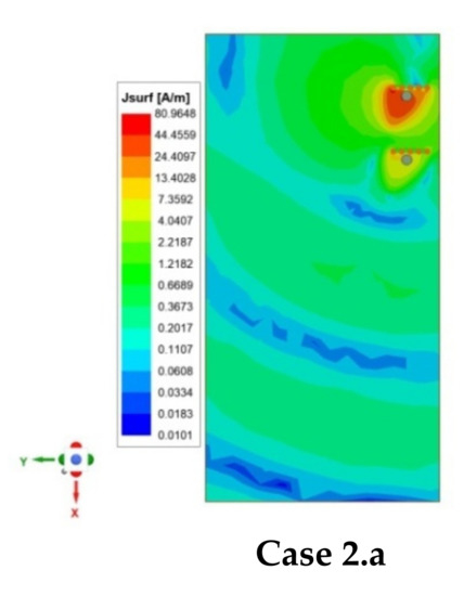 The reflection (Sii) and coupling (Sij) coefficients were plotted in all four cases, as shown in Figure 8. Similarly, surface currents on the ground plane were plotted in each case, as shown in Figure 9. As observed from Figure 8, coupling in Case1.b is minimum (−36 dB), which corresponds to the lower value of coupling surface current flowing from Ant 1 towards Ant 2, as shown in Figure 9 (Case 1.b). However, the resonating frequency of Ant 2 in Case 1.b is slightly shifted from the desired frequency, which is due to the reduced fringing fields as the resonating side of Ant 2 is on the extreme edge of the PCB. Therefore, the better choice is Case 1.a because it offers comparable isolation (35 dB) with Case 1.b and more stability in operating frequencies for both antennas.