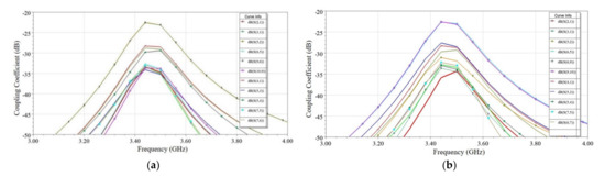 Figure 15 shows the variation of coupling coefficients in all four cases. Coupling for antenna pairs on the same edge, namely, Ant 1 and Ant 2, Ant 2 and Ant 5, Ant 5 and Ant 6, Ant 6 and Ant 9, and Ant 9 and Ant 10 are plotted in Figure 15 along with adjacent antenna pairs, namely, Ant 1 and Ant 4, Ant 3 and Ant 5, Ant 4 and Ant 5, Ant 5 and Ant 7, and Ant 6 and Ant 7. Due to symmetry, the remaining antenna pairs were skipped for brevity. It is observed from Figure 15 that in Case A, except for antenna pairs Ant 2 and Ant 5 and Ant 9 and Ant 10, all other antenna pairs’ isolation was above 28 dB. For these two pairs of antennas, the coupling was found around −22 dB.