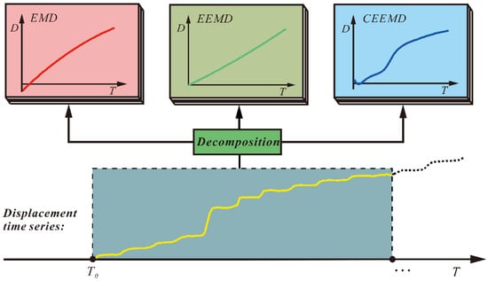 Decomposition of landslide displacement is also a vital step in a prediction model and will directly affect the prediction effect. At present, decomposition method based on signal processing technology, for instance, Fourier transform (FT), discrete wavelet transforms (DWT), wavelet transform (WT), empirical mode decomposition (EMD), variational mode decomposition (VMD), and ensemble empirical mode decomposition (EEMD), are massively used in this field [,,,]. With these methods, the landslide displacement can be decomposed into a trend term and a periodic term, and then these components of the displacement can be predicted by different models. However, when using the CEEMD (complete ensemble empirical mode decomposition), the residual term shows a trend of first decreasing and then increasing, which is difficult to predict as a trend term compared with the residual terms of EMD and EEMD (Figure 1). Hence, a novel prediction model needs to be designed when the CEEMD is adopted in the decomposition of landslide displacement.