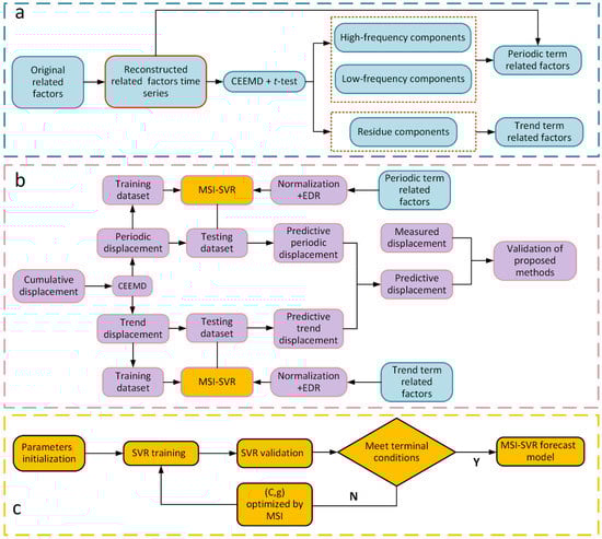 The framework of the proposed ensemble prediction model is shown in Figure 2. The entire forecasting process is divided into three steps: data preparation, multi-swarm intelligence (MSI) optimization, and displacement prediction. In the data preparation step, the time-sequences of factors related to the landslide movements, such as rainfall and reservoir water level, are restructured. The frequency component and residual component of all original and restructured sequences are then obtained through the combined application of CEEMD and t-test. In the MSI optimization step, MSI optimization algorithms are used to select the optimal and for the SVR model. In the displacement prediction step, the trend and periodic displacements are extracted from the observed cumulative landslide displacement through CEEMD. Then EDR is used to select the input variables of the periodic displacement prediction SVR model by calculating the EDR value between the periodic displacement and original related factors, restructured related factors, and frequency related factors after normalization. Similarly, the input variables of the trend displacement prediction SVR model are obtained by calculating the EDR value between the trend term displacement and all residue terms after normalization. Finally, the predictions of the trend and the periodic displacements are performed separately, and the total predicted displacement is obtained by adding them together.