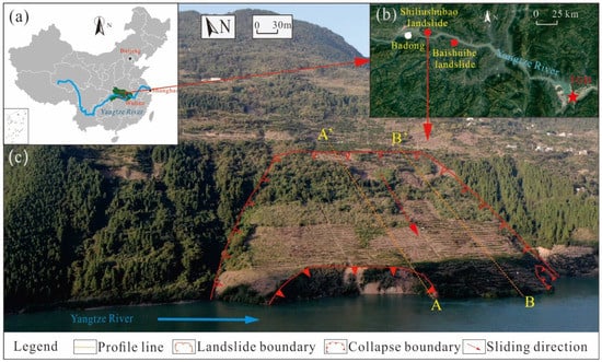 The Shiliushubao landslide is part of the famous Huanglashi landslide group, one of the large-scale landslides in the Three Gorges Reservoir Area (TGRA). It is located on the north bank of the Yangtze River, 1.5 km east of Badong county, 66 km away from the Three Gorges Dam (TGD) (Figure 3). The landslide’s geographical coordinates are 110°26′ east longitude and 31°02′ north latitude. The Shiliushubao landslide is bordered by the Lijiawan valley on the east and the Gan valley on the west, with a tongue-like shape. It is bigger than the well-known Baishuihe landslide with an estimated volume of 11.8 × 106 m3 and covers an area of 0.34 km2. The top of the landslide is at an elevation of 340 to 358 m with a width of 140 m, and the toe of the landslide is at an elevation of 68 to 80 m with a width of 570 m.