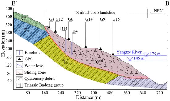 The geological profile B-B’ in Figure 4. shows that the Shiliushubao landslide occurs in the Triassic Badong Group consisting of red mudstone, siltstone, gray-green marl, and limestone. These rocks are characterized by high clay mineral content (about 68%). Exposure of the rock to water allows the rock to soften and weaken. The sliding mass also includes near-surface Quaternary soils. The rear edge of the landslide is mainly a loose accumulation of gravel and clay. This soil is weak and is prone to collapses or sliding along the bedrock surface. The sliding zone consists of clay or silty clay with some gravel. The thickness of the sliding zone varies from 1.0 to 4.9 m, with an average thickness of 2.0 m.