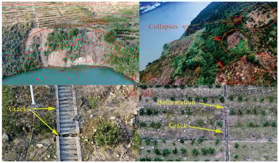 The ground collapses (a,b) and cracking (c,d) in the toe area captured by UAV, October 2020.