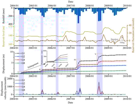From February 2004 to December 2009, field monitoring was conducted to study the Shiliushubao landslide movements, based on which, the deformation evolution characteristics and development trend of the Shiliushubao landslide can be mastered. A total of sixteen GPS monitoring points and 15 boreholes were arranged on the surface of the sliding mass (Figure 5). Some monitoring points were destroyed due to rainfall, landslide movement, and other reasons. Thus, only monitoring data from February 2004 to December 2009 have been recorded and preserved. The cumulative displacement data from GPS points G1, G2, G4, G8, plus the rainfall and reservoir water levels were selected and shown in Figure 7.