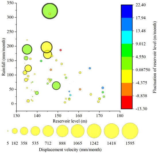 For a better understanding of this seasonal deformation acceleration’s related factors, a correlation analysis between displacement velocity at G1 (located at the northeast edge of the landslide) and rainfall, rate of reservoir level change, and reservoir level are shown in Figure 8. The size of the bubbles represents the deformation velocity. The larger bubbles tend to plot where the rainfall is higher. Meanwhile, the large bubbles are mainly concentrated where the reservoir level is between 140 and 150 m and are located where the reservoir level fluctuates slowly (between −4.4 and 9.0 m/month). This indicates that reservoir level fluctuations mainly trigger accelerated landslide movements when the reservoir level is low. The maximum size bubble appears where the rainfall is about 325 mm/month, and the water level rises between 4.5 and 9.0 m/month. The combined effect of heavy rainfall and rising reservoir level on landslide deformation is more significant than low rainfall combined with reservoir level drawdown.