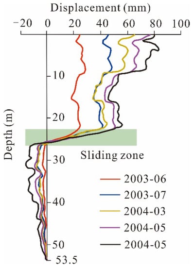Inclinometer D7 indicates that the main sliding zone is located at a depth of 22 to 26 m (Figure 9). The data show that before June 2003, the shear deformation in the slip zone was slow. Then, with the operation of the TGRA, the displacement in the shear zone increases. Therefore, it can be judged that the Shiliushubao landslide is in the stage of accumulative creep deformation, and the deformation tends to be intensified under the influence of reservoir water.