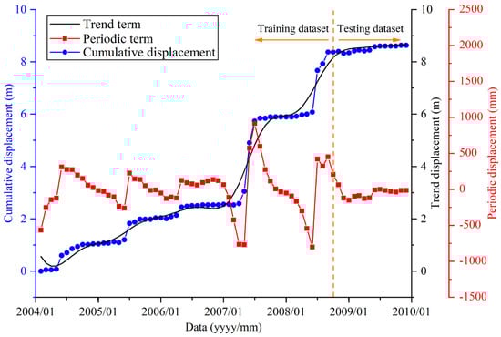 The displacement data are divided into training and testing data sets to establish the SVR prediction model of periodic and trend displacements (Figure 10). The SVR model is organized with the training dataset to establish the regression relationships between displacement and selected variables. The trained SVR model can then be used to predict the current month periodic displacement and compared with the testing dataset to verify the model’s accuracy. In this study, the displacement data from February 2004 to September 2008 were selected as the training dataset, and the rest were used as the testing dataset.