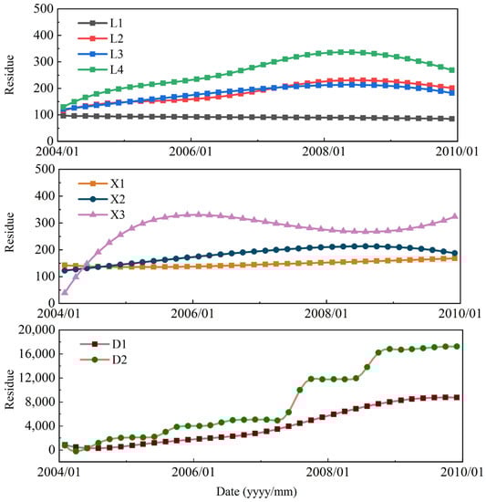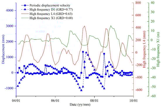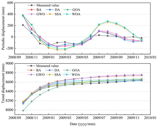 The results show that the trend displacement component of G1 has local fluctuations and an increasing trend over time, which is consistent with a long-term trend of cumulative displacements. The periodic displacement component shows a cyclical variation in displacements ranging from −800 to 917 mm. The maximum variation range of periodic displacement occurred in the 2007 rainy season when the TGR was first impounded. As the periodic displacement and trend displacement are important components of the cumulative displacement, they will be separately modeled and predicted. Once the best prediction for each component is obtained, the best prediction for cumulative displacement is obtained.